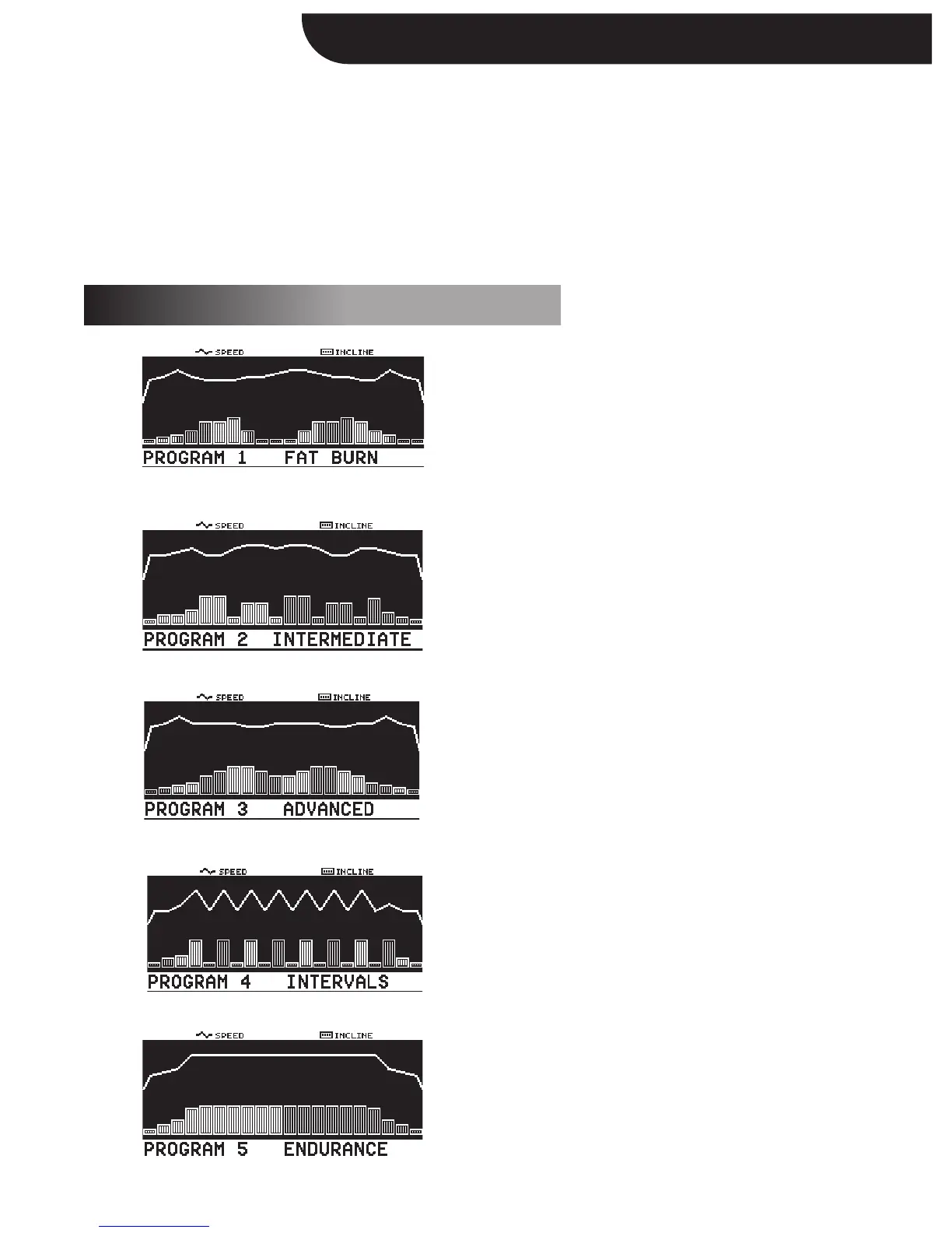 speed, incline and time from 5 to 99 minutes. (Intervals Program requires a minimum speed and incline). Once set, the