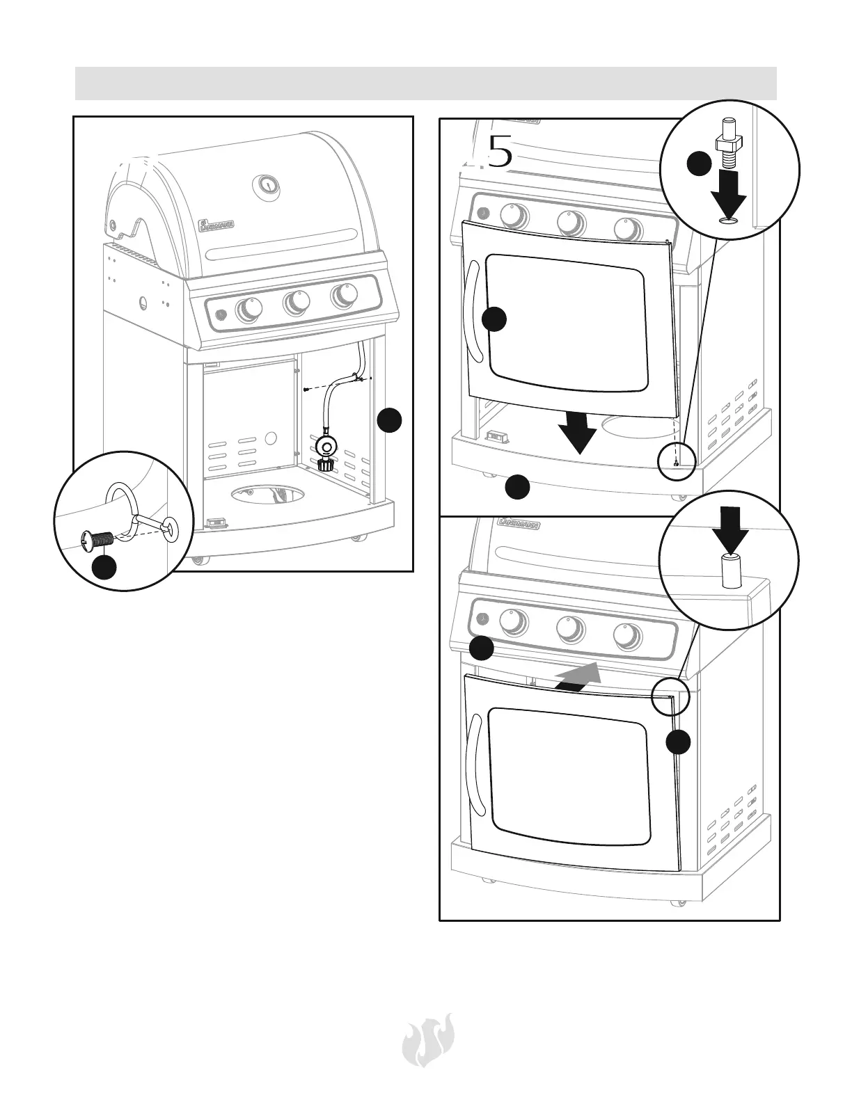 Thread door bottom pin (L) into hole on bottom panel