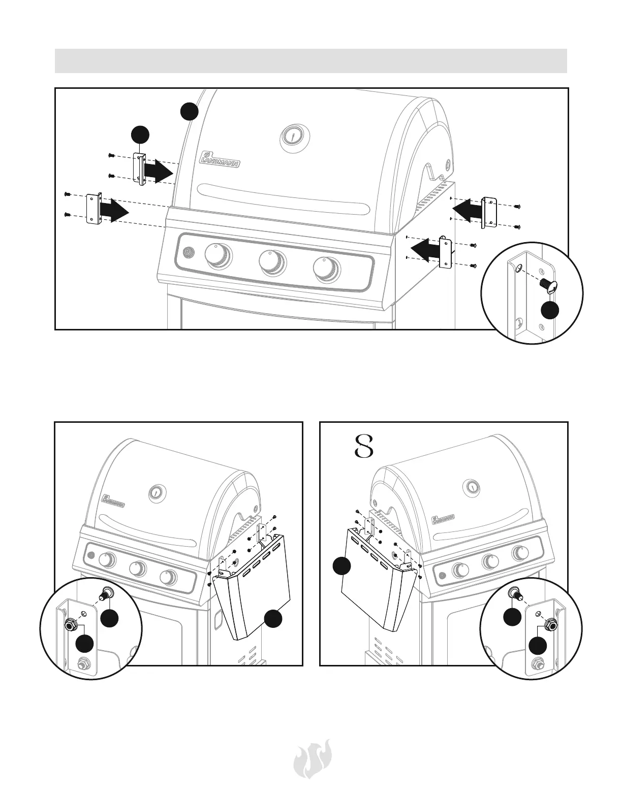 Una los soportes de los estantes laterales (M) al lado izquierdo y derecho del cuerpo de la parrilla (J). Fíjelos con