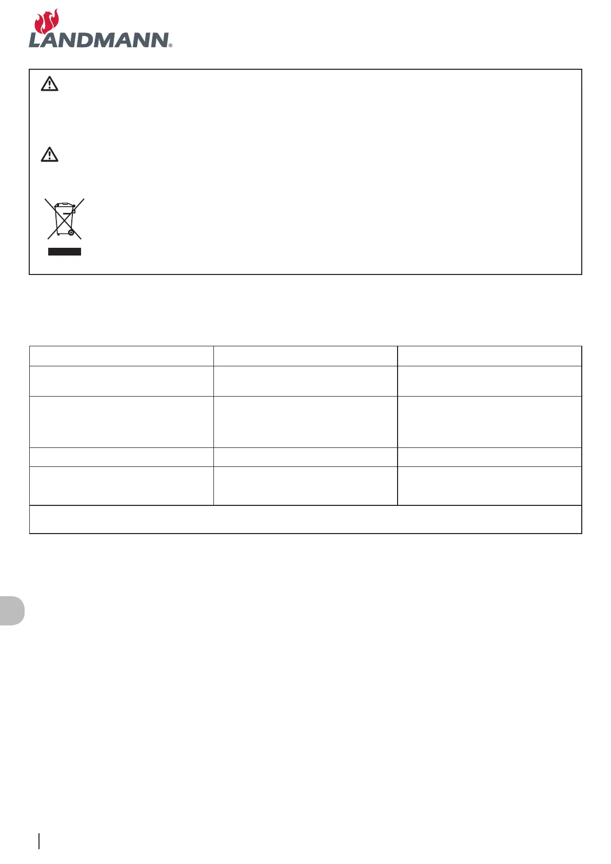 ĮSPĖJIMAS. Nebandykite remontuoti komponentų patys ir kreipkitės į „Landmann Products“ klientų