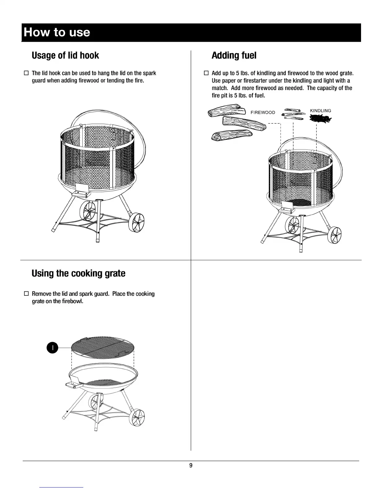 Landmann Heatwave 28051 - How to use; Usage of lid hook; Adding fuel; Using the cooking grate