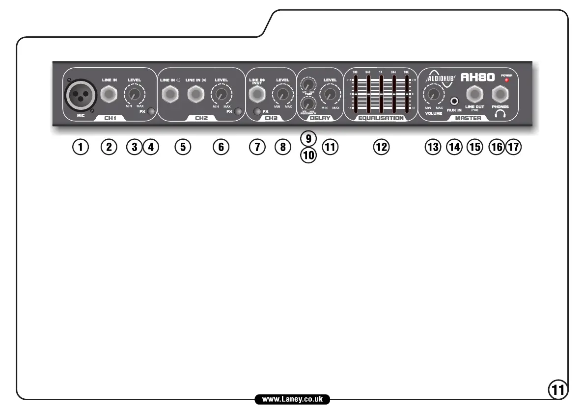 9. DELAY TIME Controls the amount of time between repeats of the inbuilt delay. Turning this control clockwise will increase the delay time.