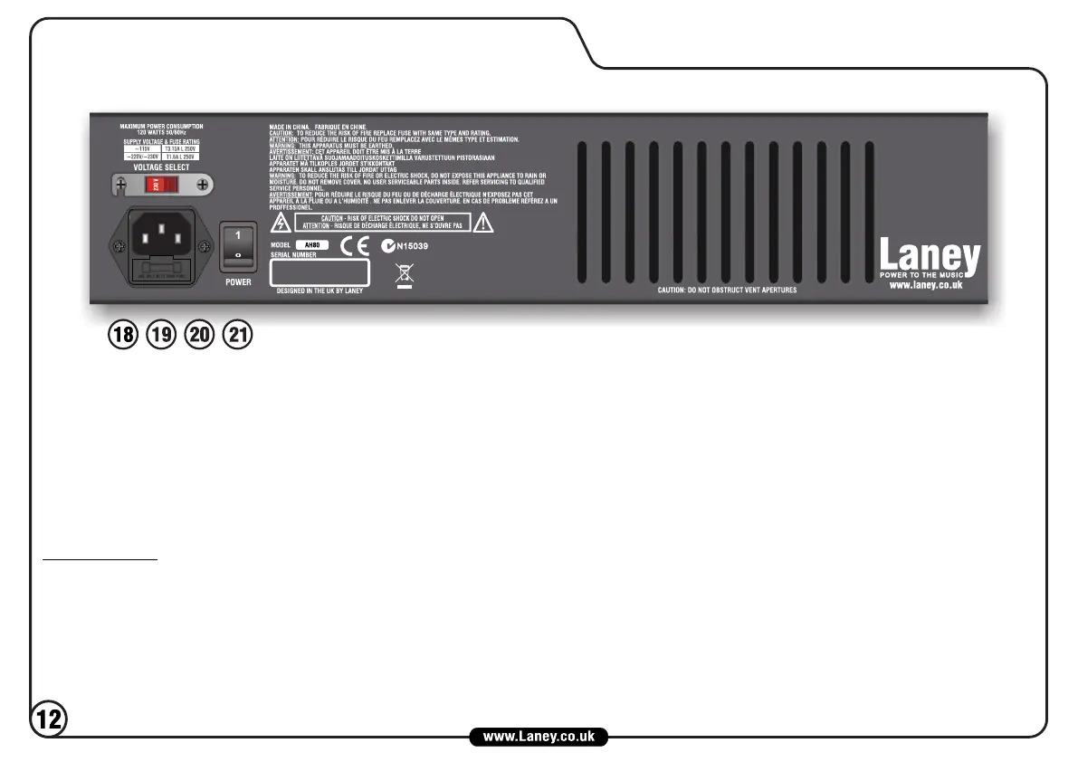 19. MAINS INLET SOCKET Connect to your power source using the supplied cable.