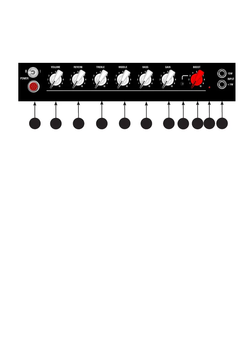 4 - TREBLE - Controla la respuesta de las frecuencias altas del amplicador. Ajuste en 4 o 5 para comen