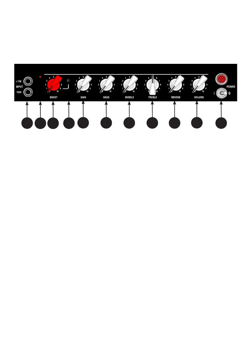 1 - Entradas INPUT - 15W & <1W. Conecte su guitarra a la entrada de 15W para tener toda la potencia del
