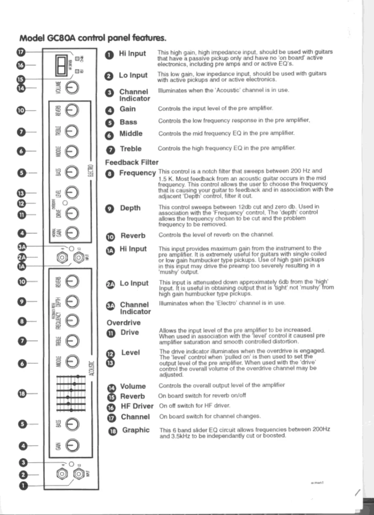 Laney GC50A - Laney GC80 A Control Panel Features; Acoustic Channel Inputs & EQ; Acoustic Channel Feedback Filter & Reverb; Electro Channel Inputs & Indicators