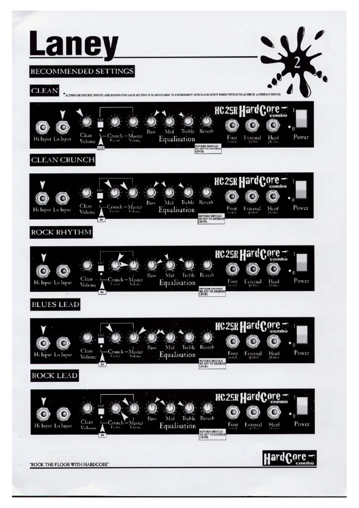 Laney Hardcore Combo HC25 - Recommended Settings HC25 R; Clean Tone Settings; Clean Crunch Tone Settings; Rock Rhythm Tone Settings