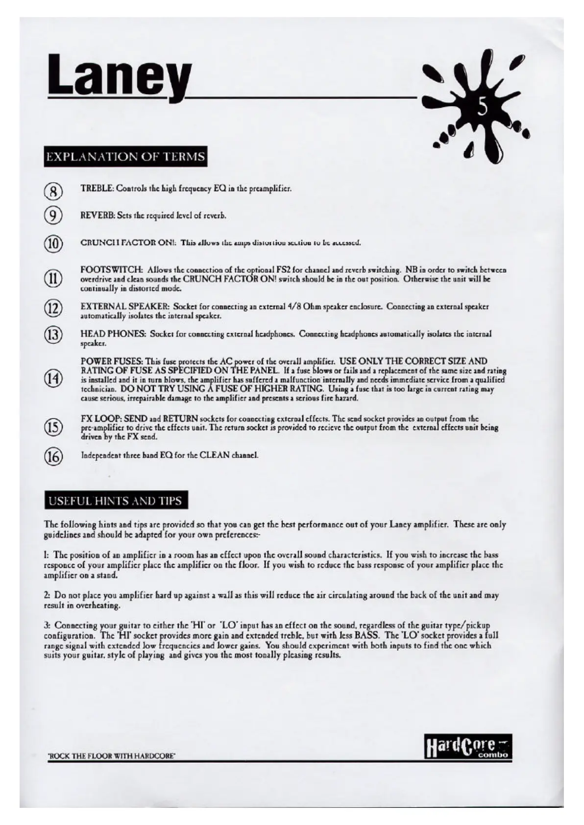 Laney Hardcore Combo HC25 - Operational Guidance and Specifications; Explanation of Terms (Continued); Useful Hints and Tips