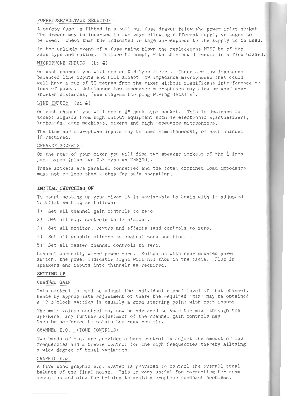 Laney TH6150 - Laney Mixer Amplifier Setup and Operation; Power Fuse and Voltage Selector; Input Types and Usage; Initial Switching On and Setup Procedure