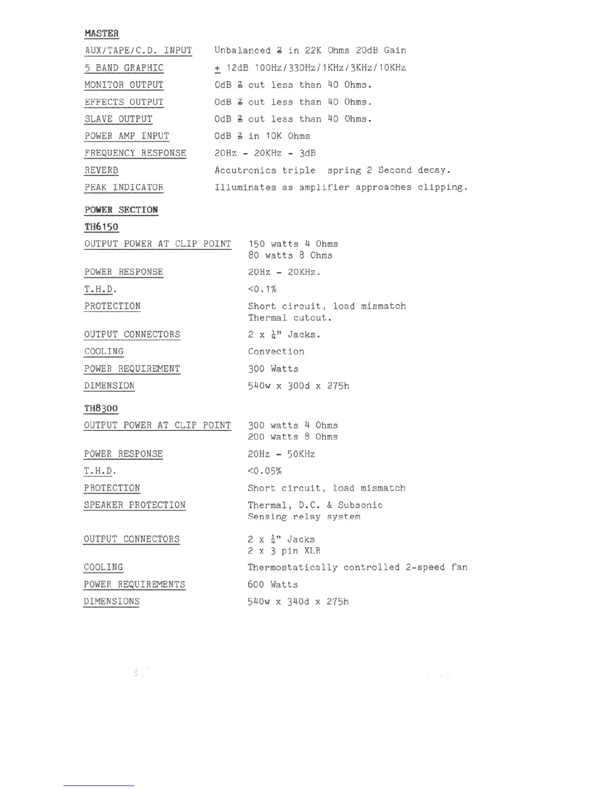 Laney TH6150 - TH6150 Power Section Specifications; TH8300 Power Section Specifications