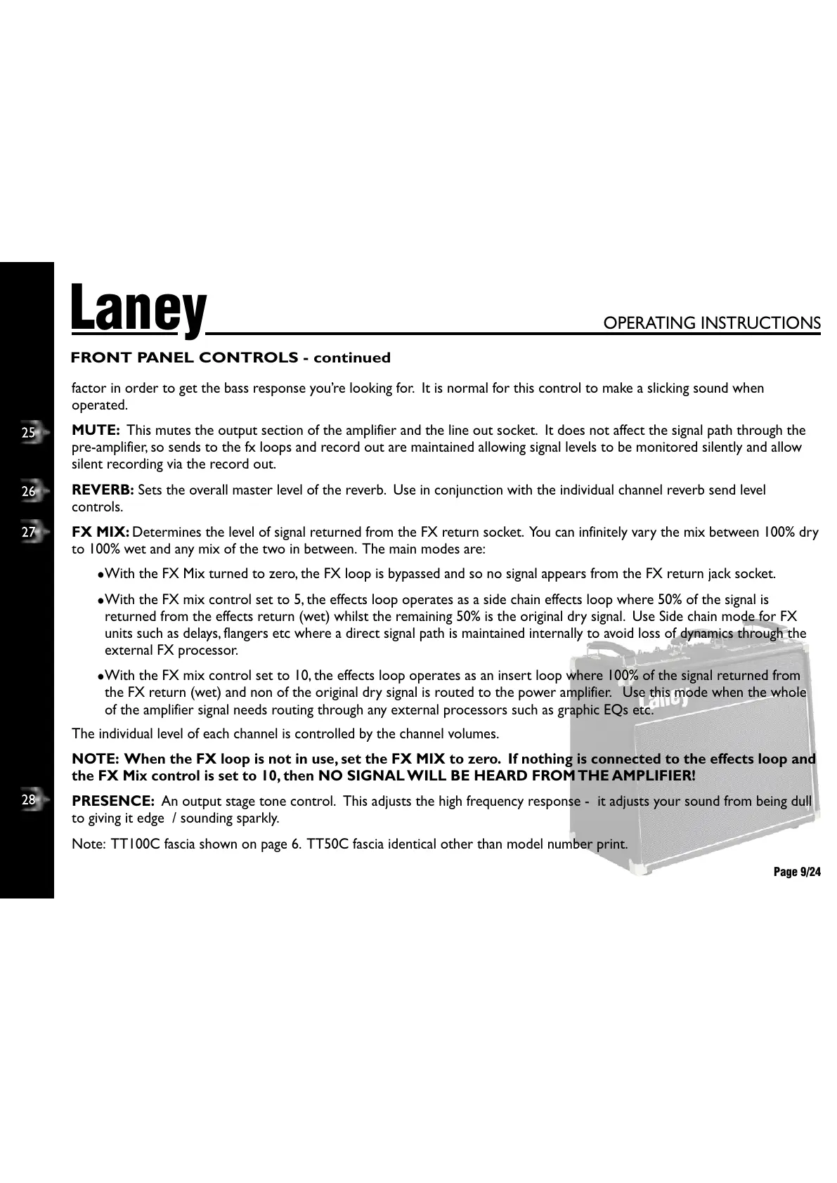 the FX Mix control is set to 10, then NO SIGNAL WILL BE HEARD FROM THE AMPLIFIER!