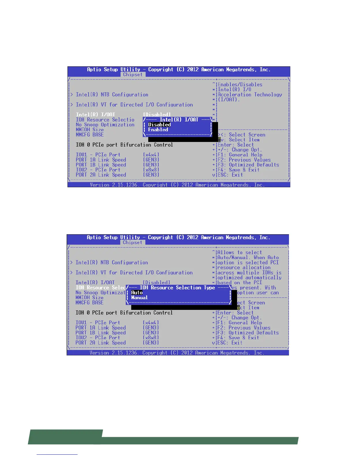 IOH Resource Selection: you may select “Auto” or “Manual” for your I/O hub (IOH) resource allocation. If you select