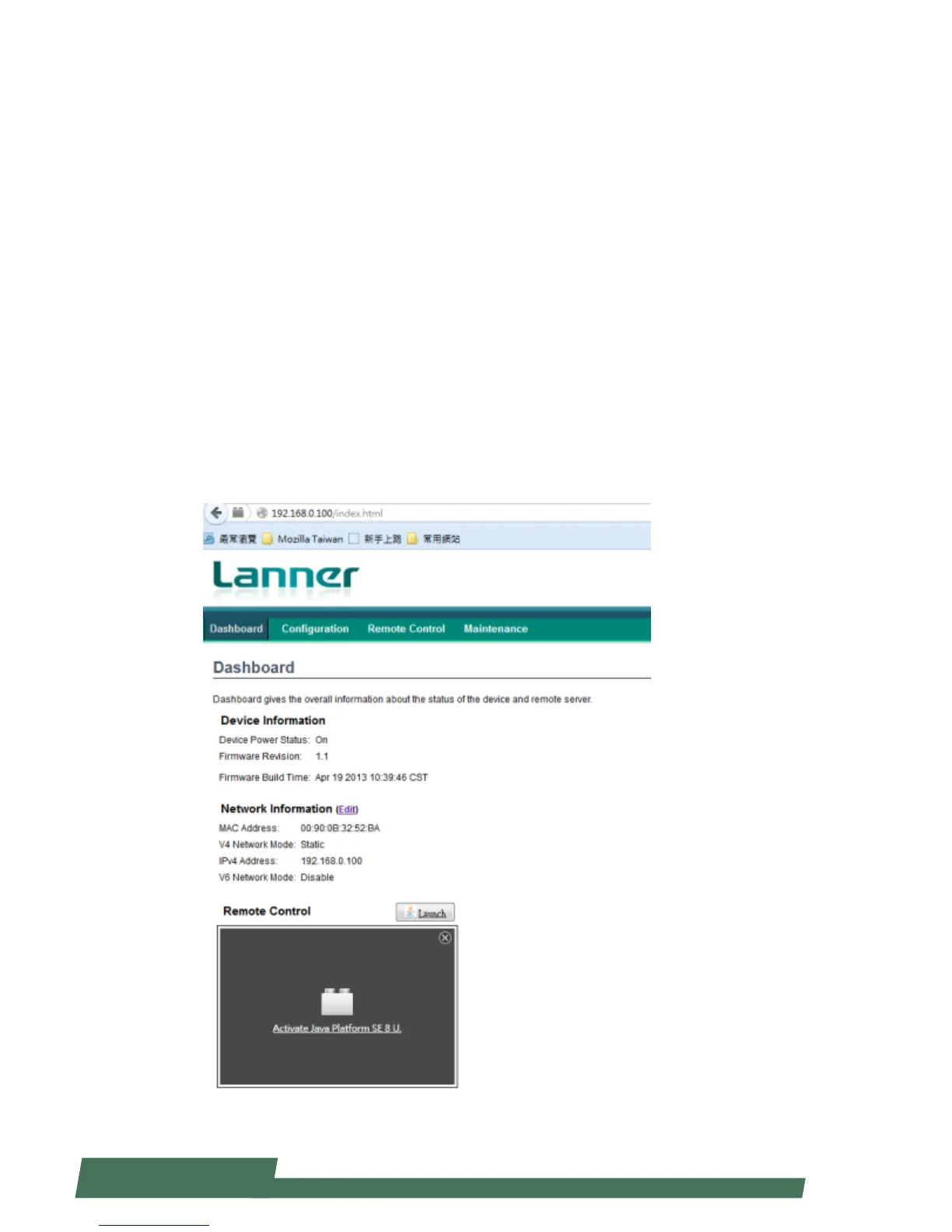 The “Dashboard” provides an overall information about the stauts of the device and remote server.