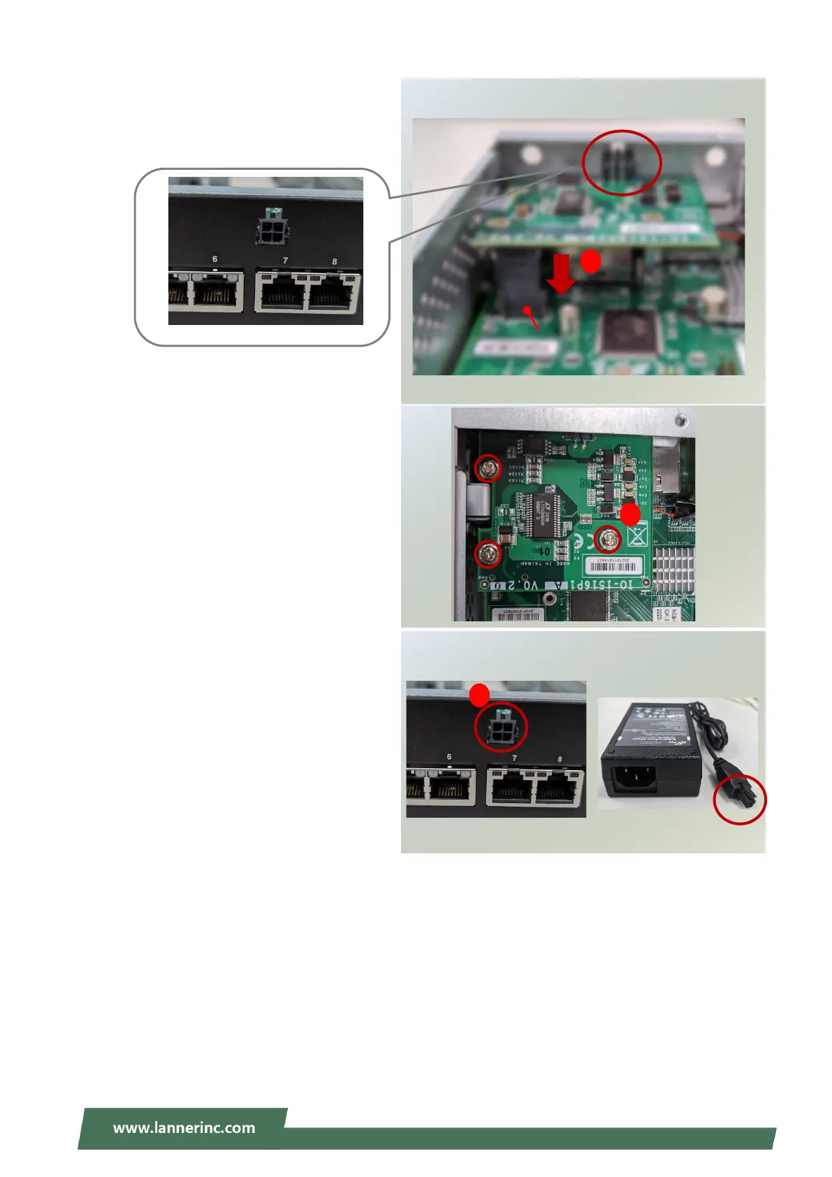 Lanner NCA-1516 - PoE Module Installation Steps; Align and Insert PoE Connector Pins; Secure PoE Module Board; Connect Power Adapter to PoE Module