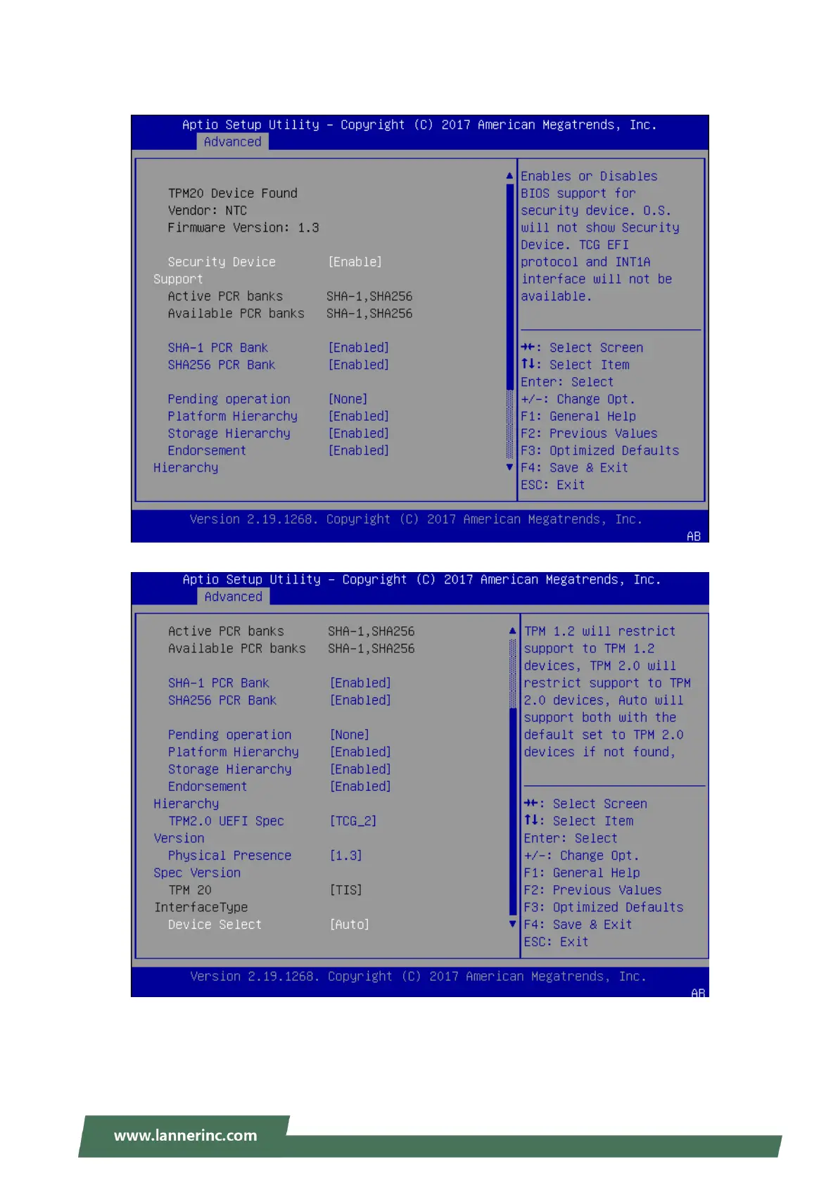 Lanner NCA-1516 - Trusted Computing Settings; TPM Device Support Configuration; TPM 2.0 UEFI Spec Version Setting