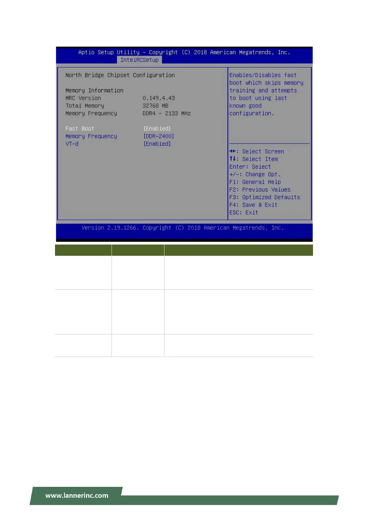 Lanner NCA-1516 - North Bridge Chipset Configuration; Memory Information and Frequency Settings; Fast Boot and VT-d Settings