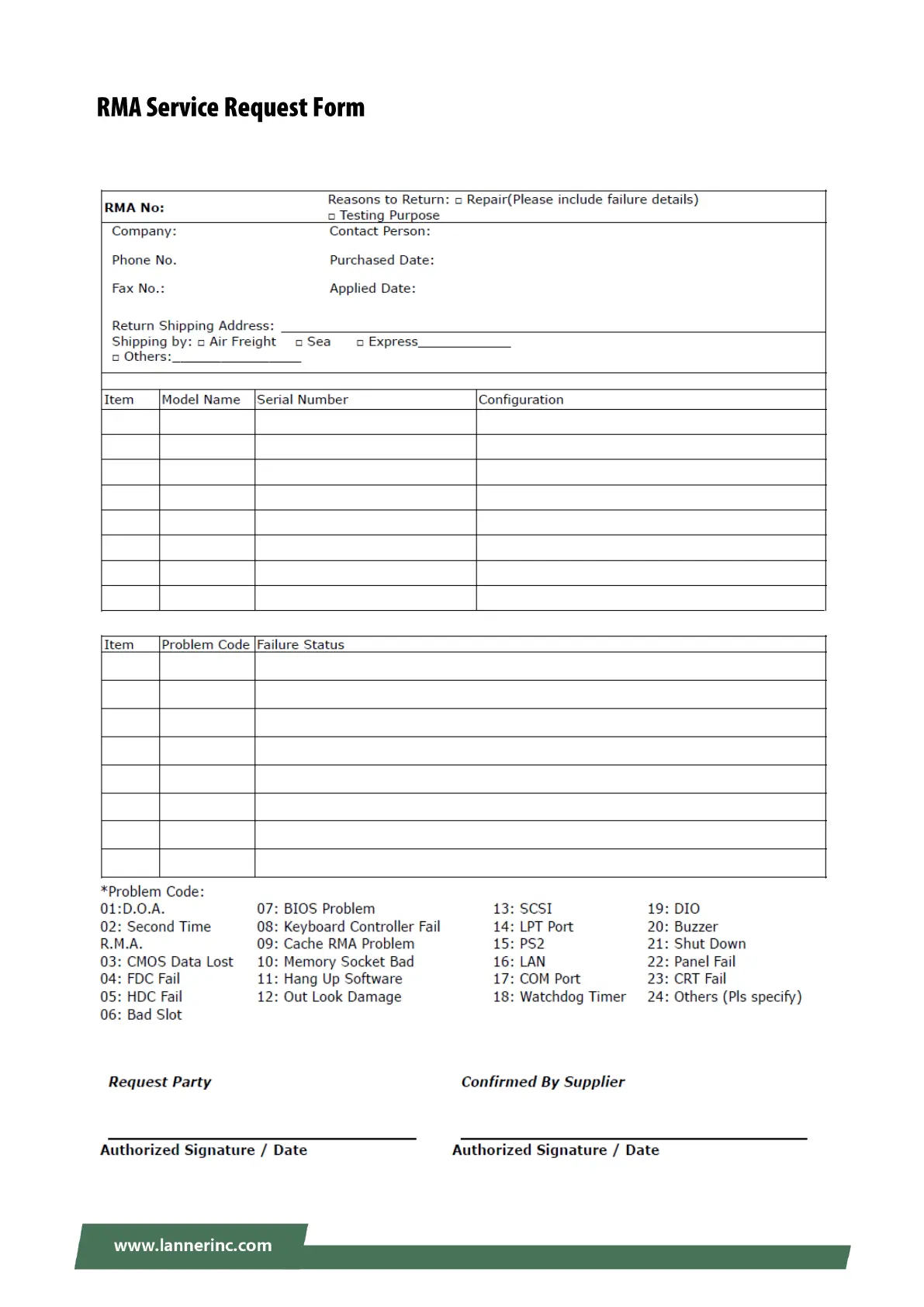 Lanner NCA-1516 - RMA Service Request Form; RMA Form Fields and Requirements; Problem Code List for RMA