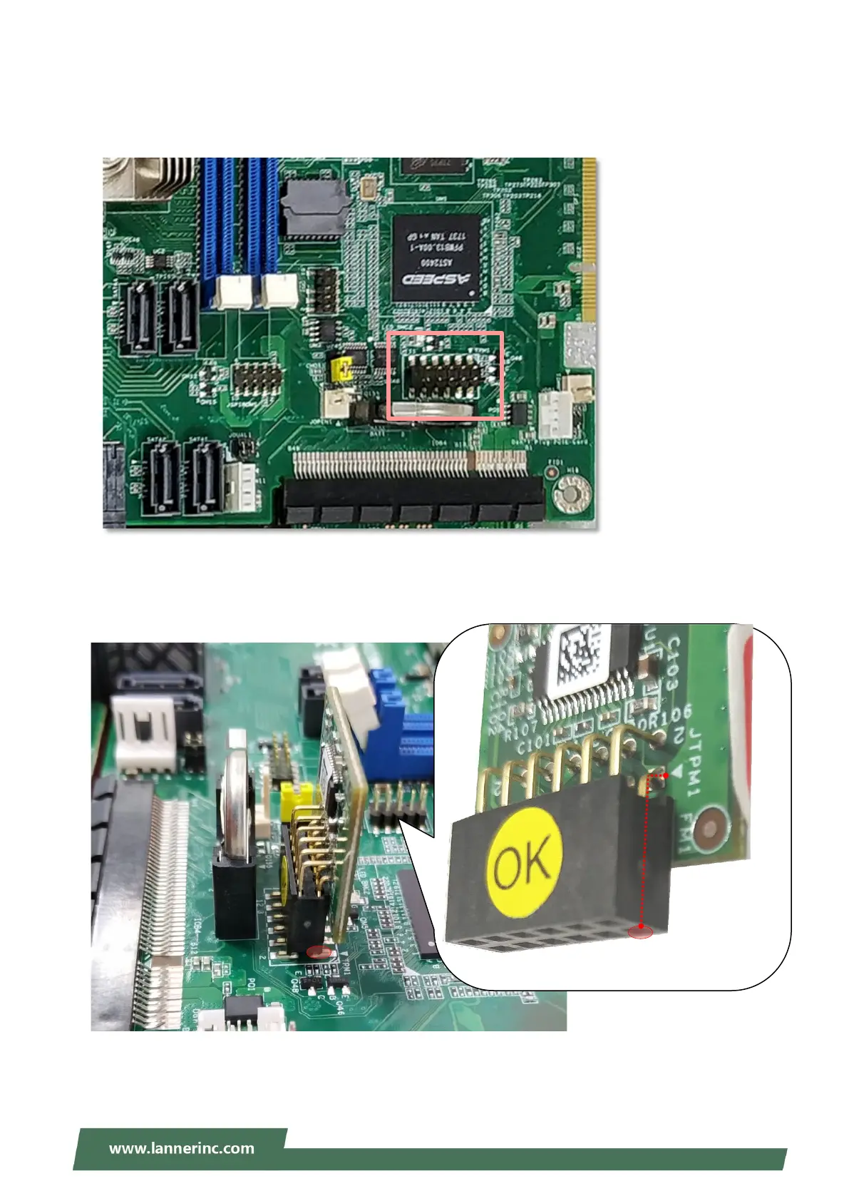 2. Insert the TPM module. It is important the PIN 1 marked on the connector is inserted into the