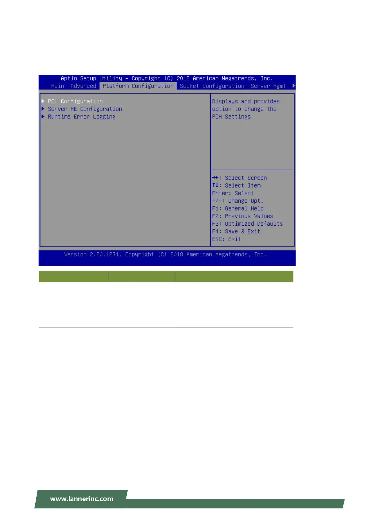 Select the Platform menu item from the BIOS setup screen to enter the Platform Setup screen. Users can
