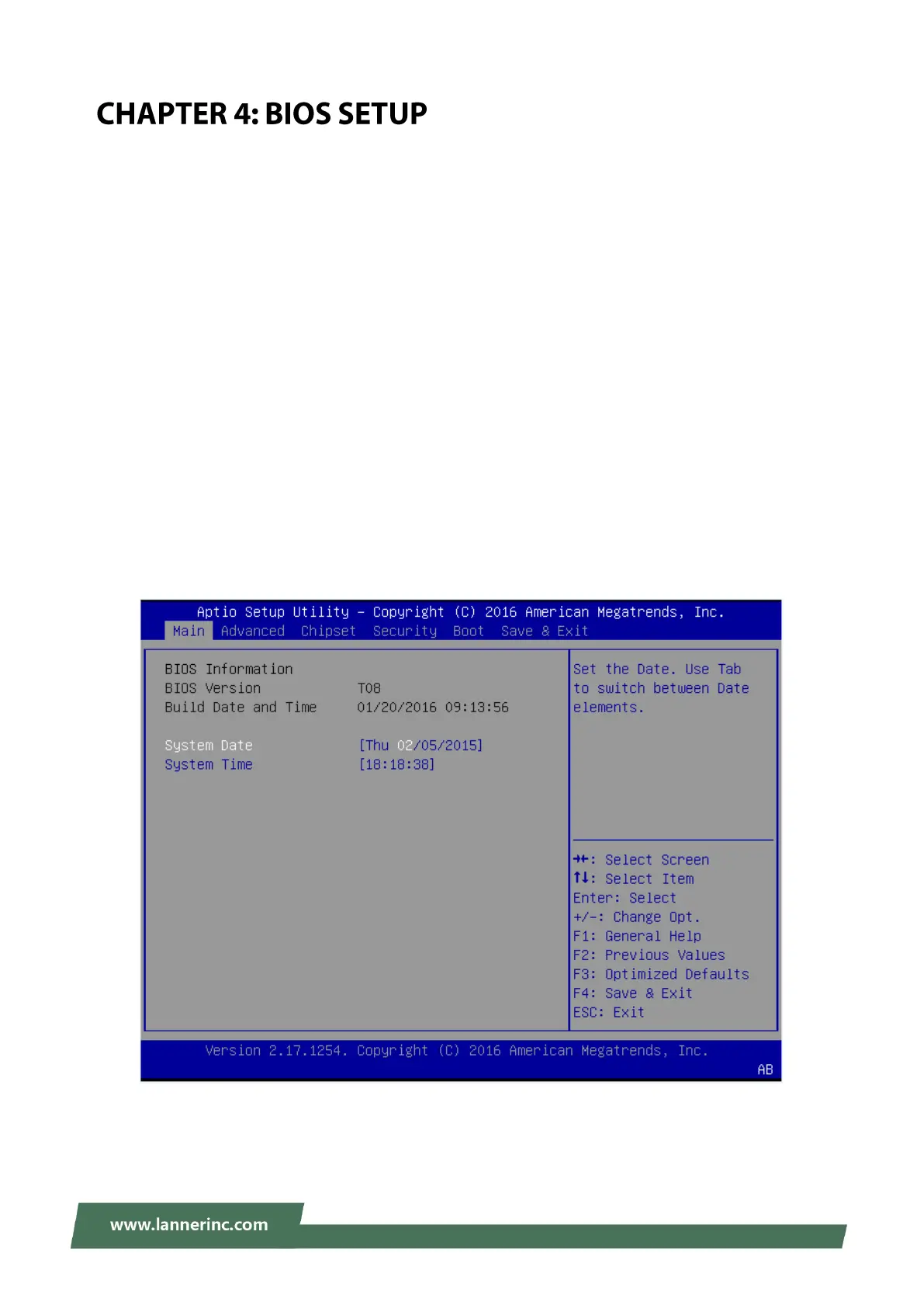 [<--] [-->]: select a setup screen, for instance, [Main], [Advanced], [Chipset], [Boot], [Security], and [Save &