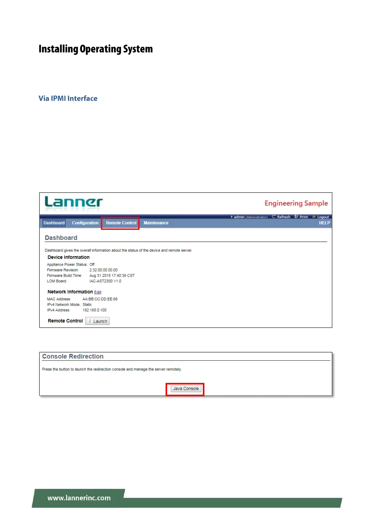 4. After entering the main screen, select “Remote Control”>“Console Redirection,” and then click on “Java