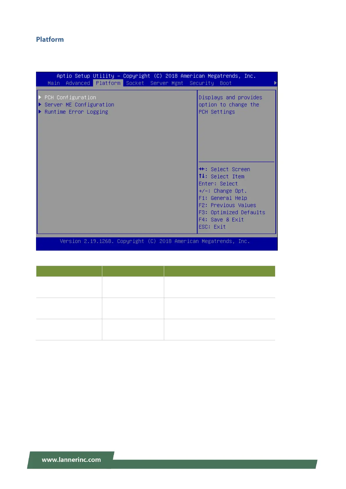 Select the Platform menu item from the BIOS setup screen to enter the Platform Setup screen. Users can