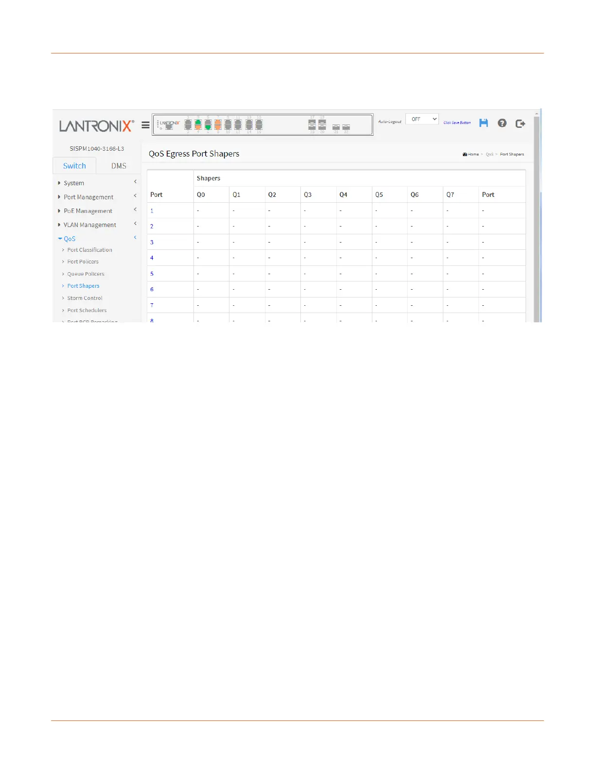 This page provides an overview of QoS Egress Port Shapers for all switch ports.