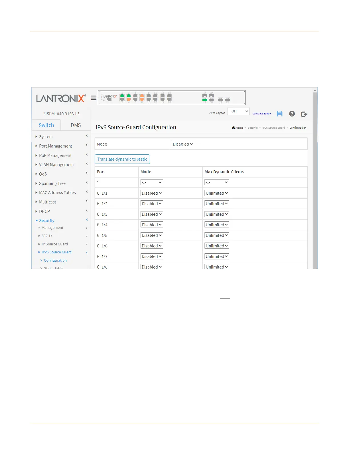 disabled on individual ports. IPv6 Source Guard is enabled on a given port only when both Global Mode and Port