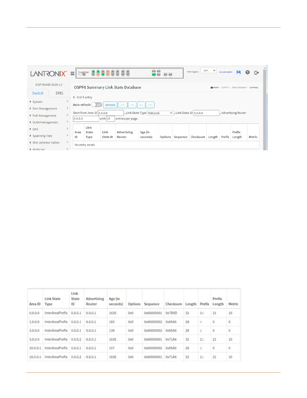 Set the Start from Area ID, Link State Type, Link State ID, Advertising Router, and entries per page controls.