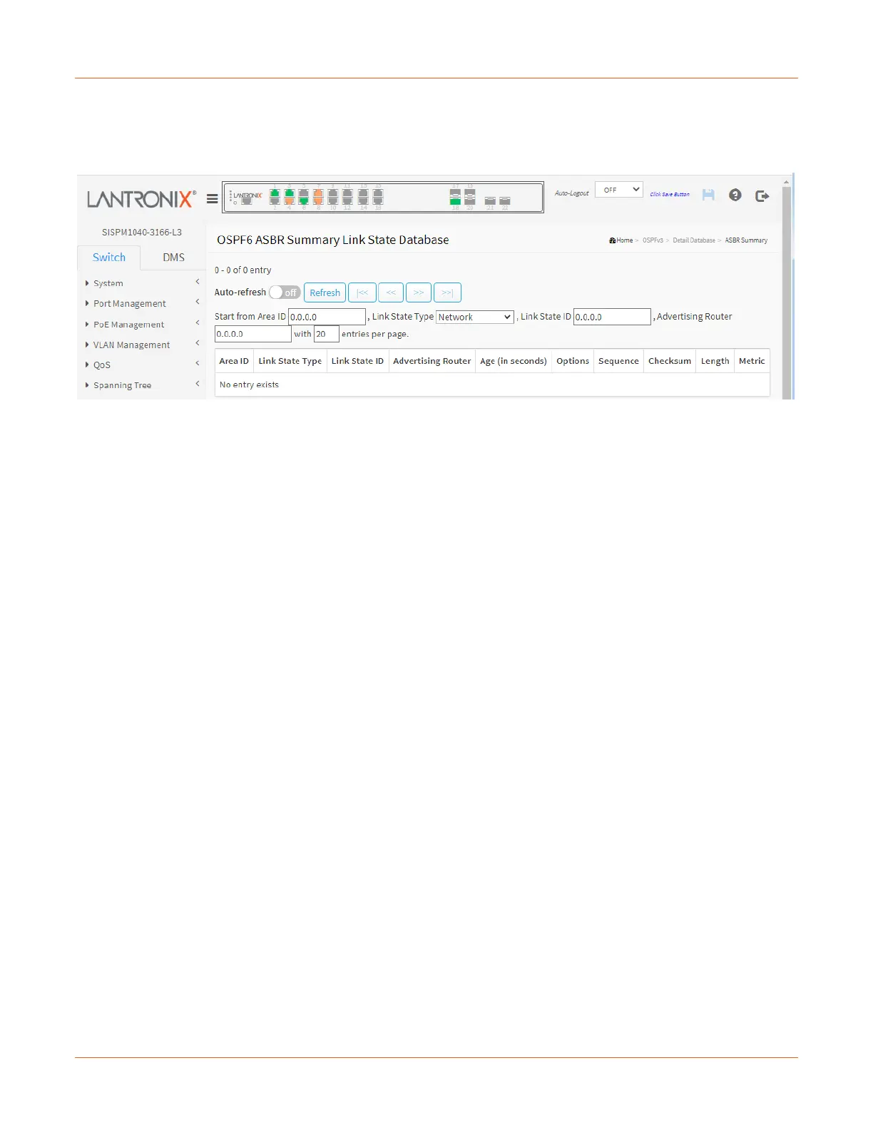 This page displays the OSPF6 LSA ASBR Summary link state database information table. Set the Start from Area