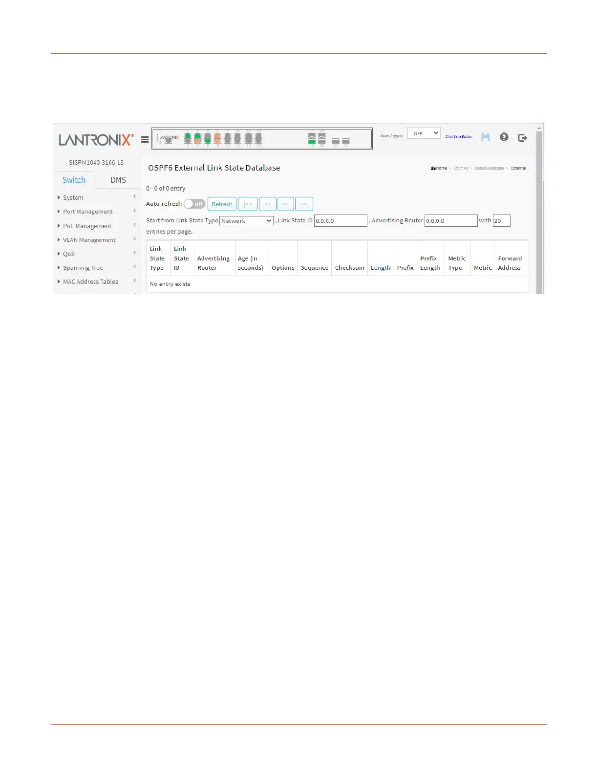 This page displays the OSPF6 LSA External link state database information table. Set the Start from Link State