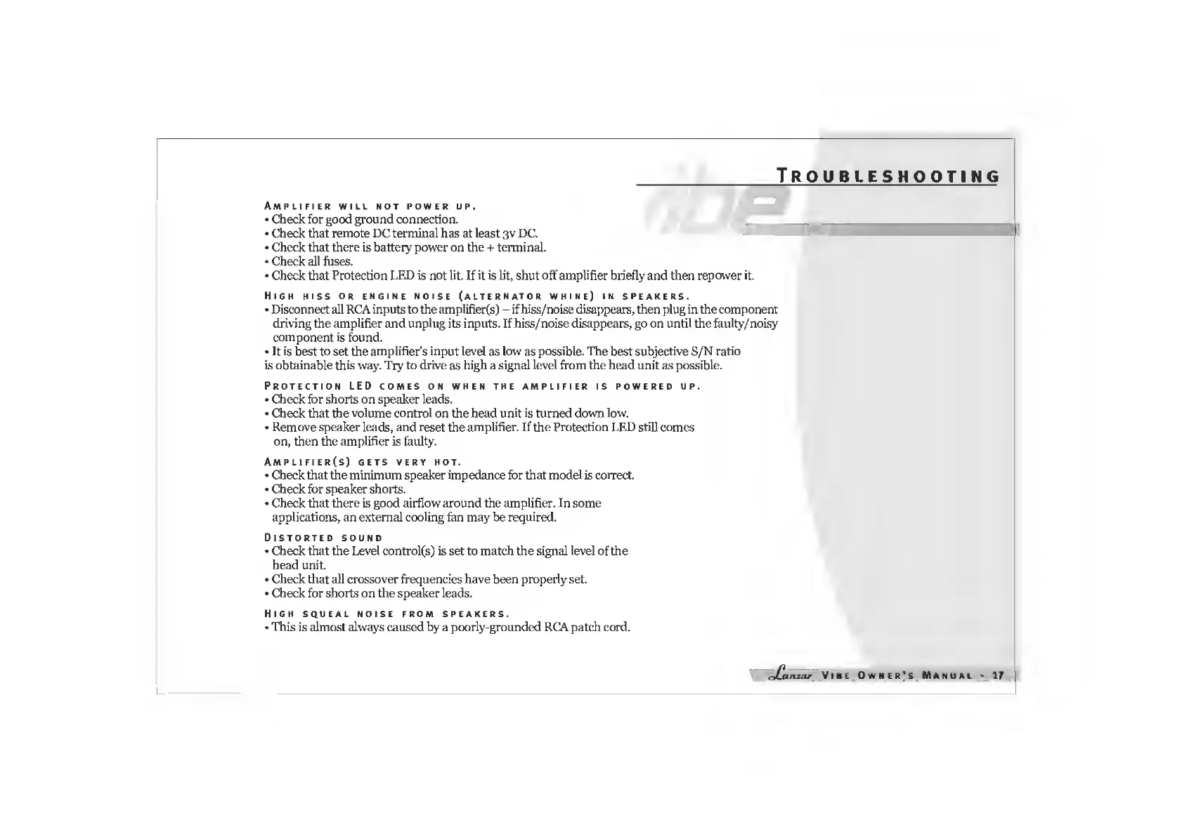 Lanzar VIBE211 - Troubleshooting Guide; Power and Protection Faults; Audio Quality Issues