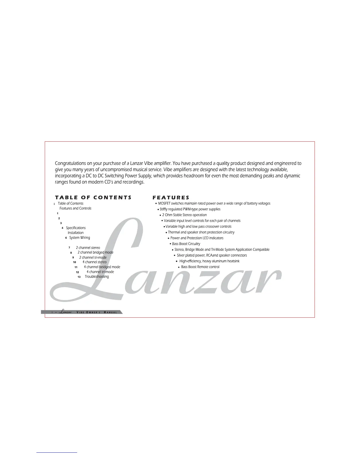 Lanzar VIBE452N - Table of Contents; Features