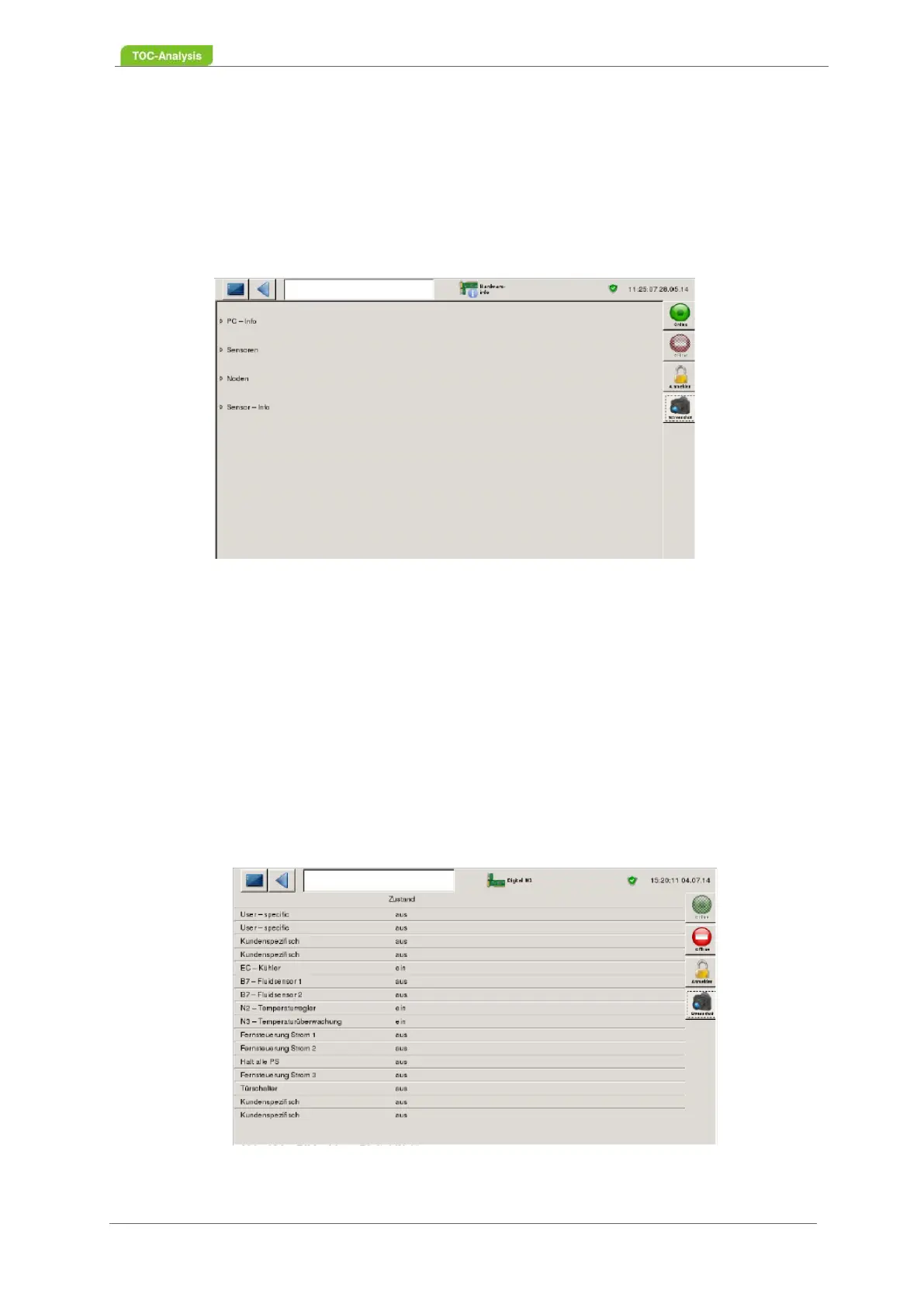 Furthermore, the voltages of the analog inputs of the respective device parts are displayed.