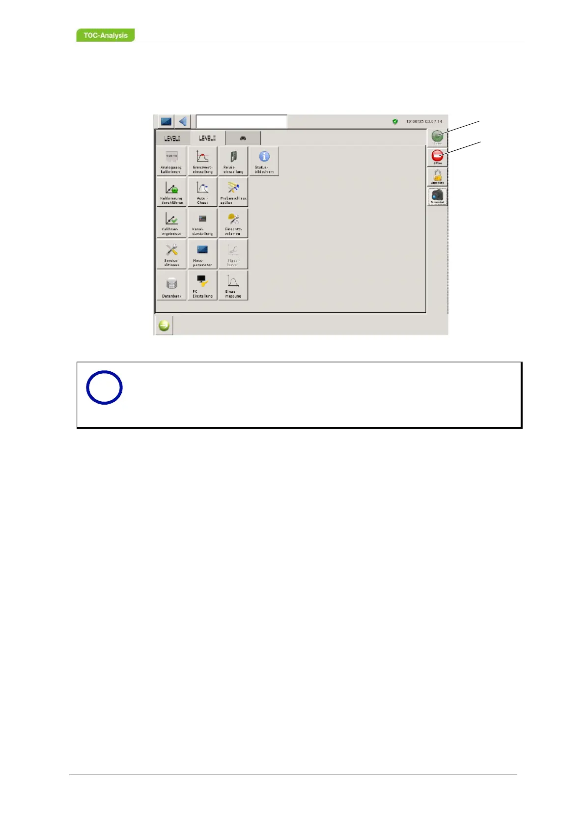 After pressing the green "Online" button (1), the analyser goes into RUN mode. To cancel a running