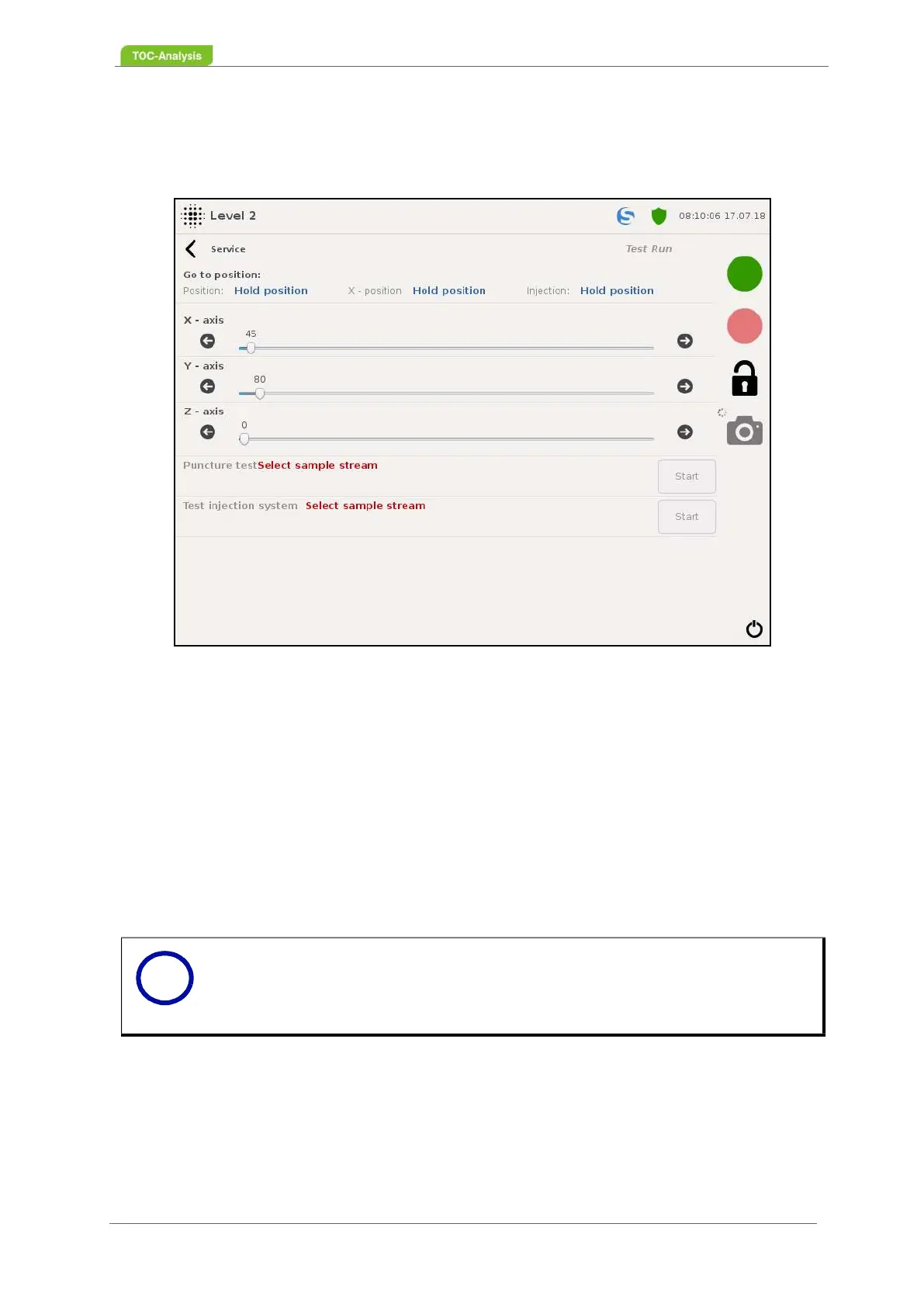 "Test of the injection system" can be started. For this purpose, the injection needle moves over the selec-