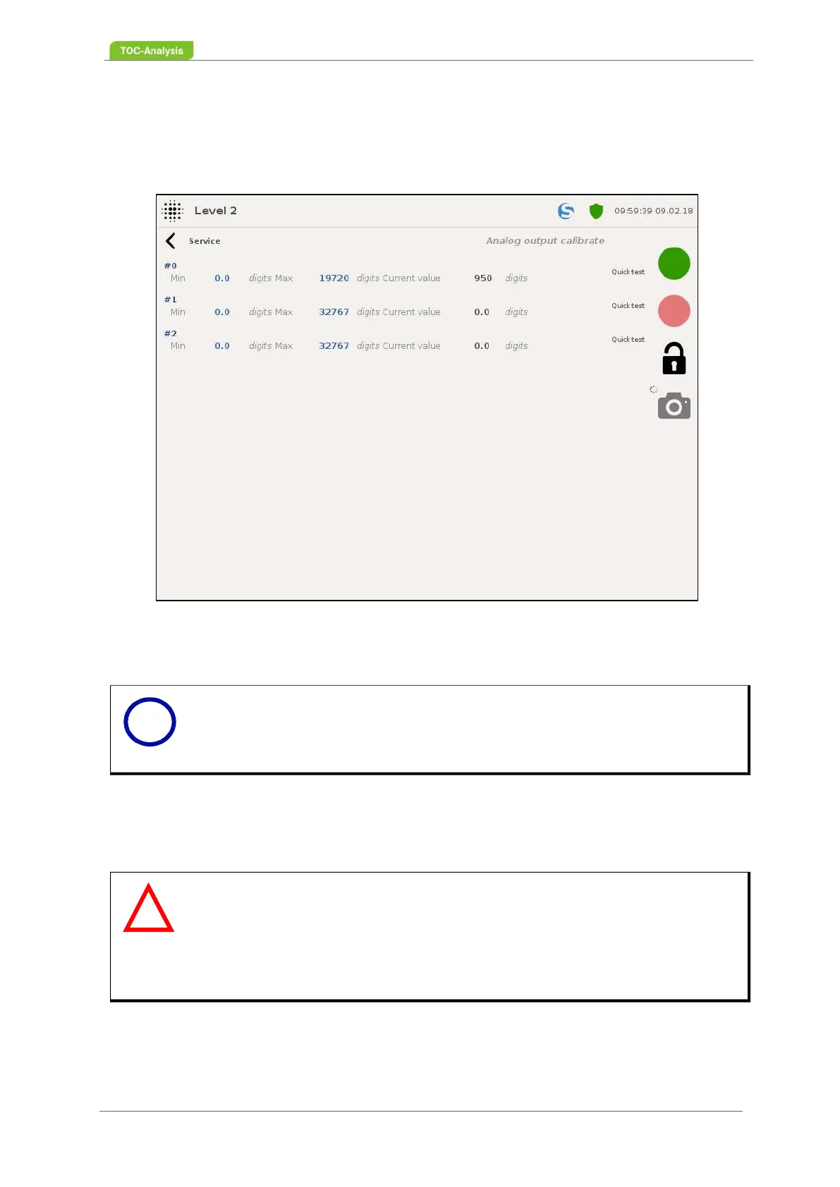 In this display, a quick test of the available analog outputs can be performed. In addition, an analog out-