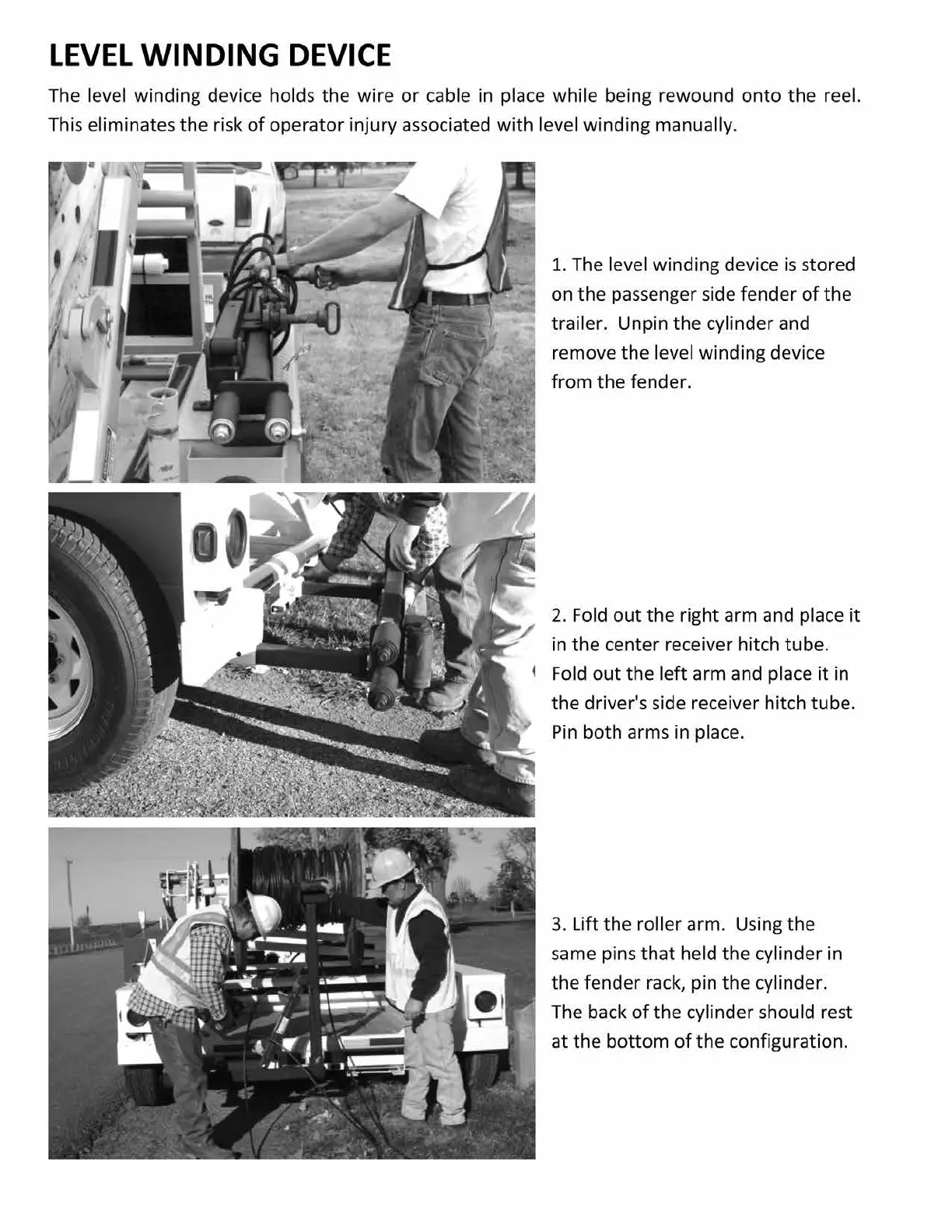 The level winding device holds the wire or cable in place while being rewound onto the reel.
