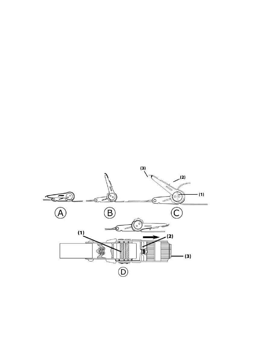 De band wordt gespannen door de ratelhendel (3) heen en weer te bewegen (zie afb. A, B en C).
