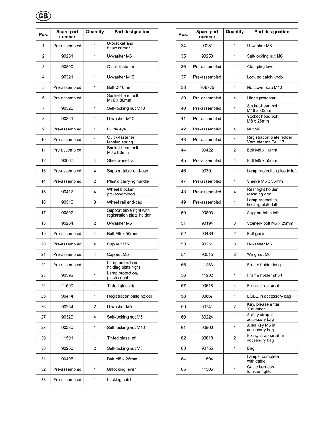 Spare parts overview - Table