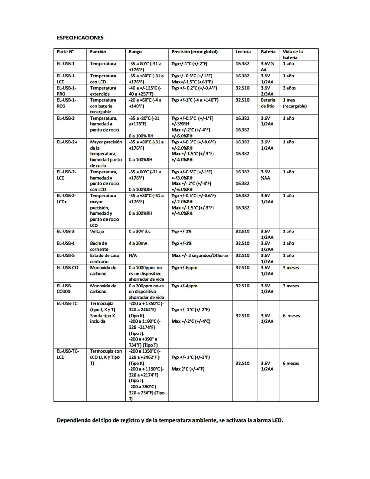 Lascar Electronics EL-USB-2-LCD - Specifications; Model Specifications Table