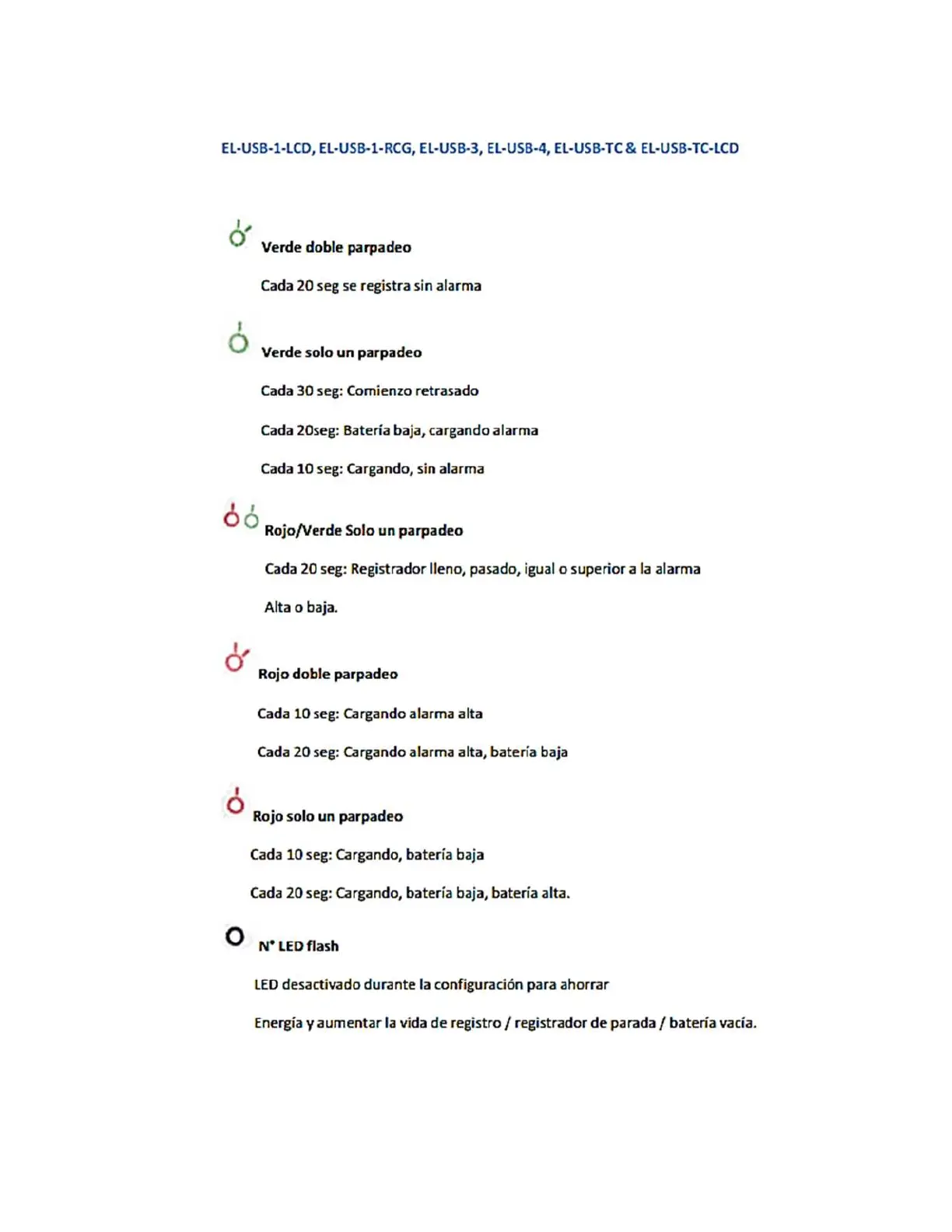 Lascar Electronics EL-USB-2-LCD - Other Models LED Indicators; EL-USB-1-LCD, EL-USB-1-RCG, EL-USB-3, EL-USB-4, EL-USB-TC & EL-USB-TC-LCD Patterns