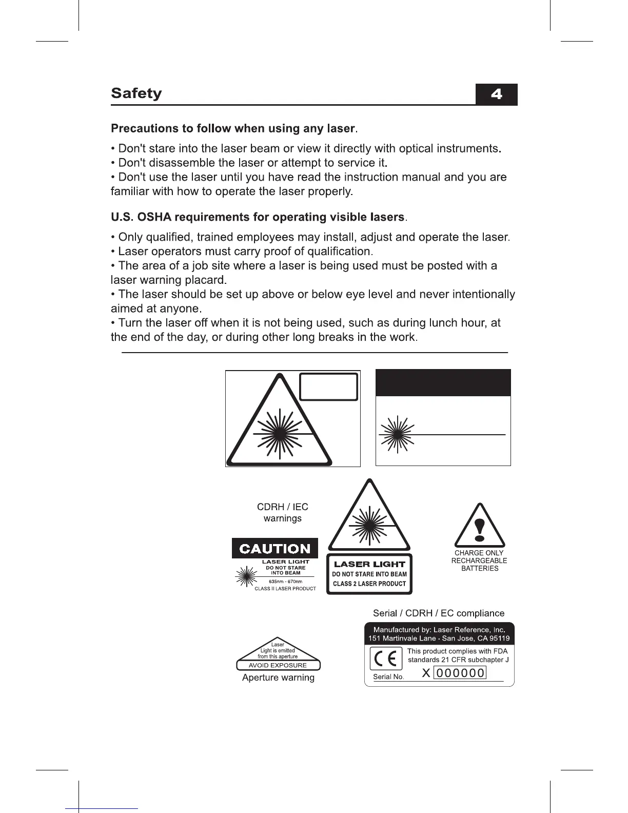 Laser Reference Pro Shot Alpha - Safety Information; General Laser Safety Precautions; U.S. OSHA Visible Laser Requirements