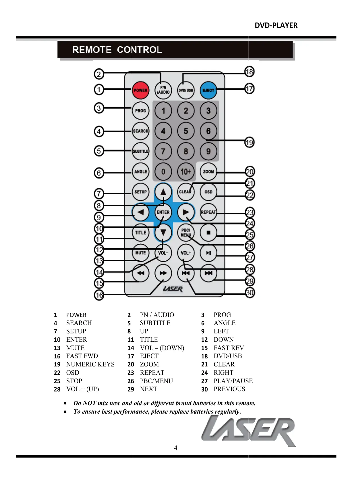 Laser DVD-HD007 - Remote Control Operation; Remote Control Layout; Battery Installation