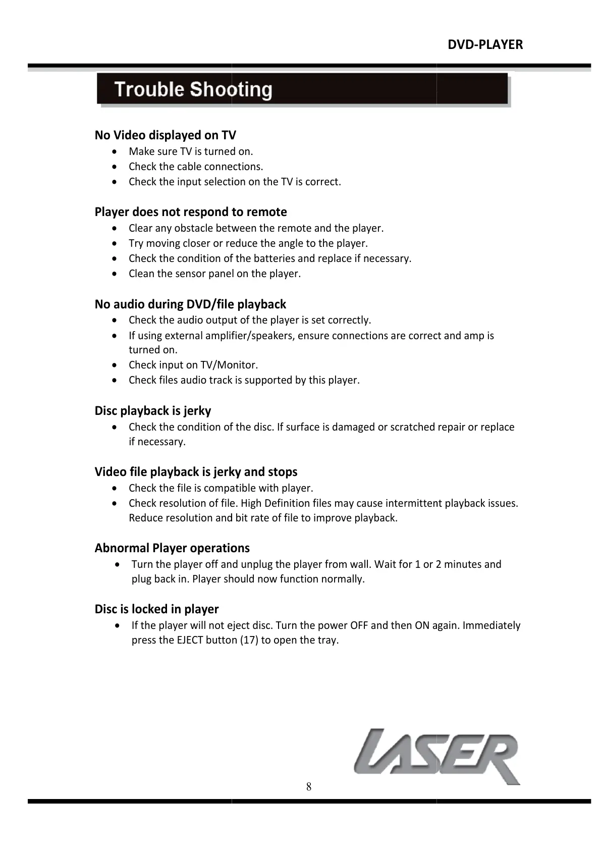 If the player will not eject disc. Turn the power OFF and then ON again. Immediately