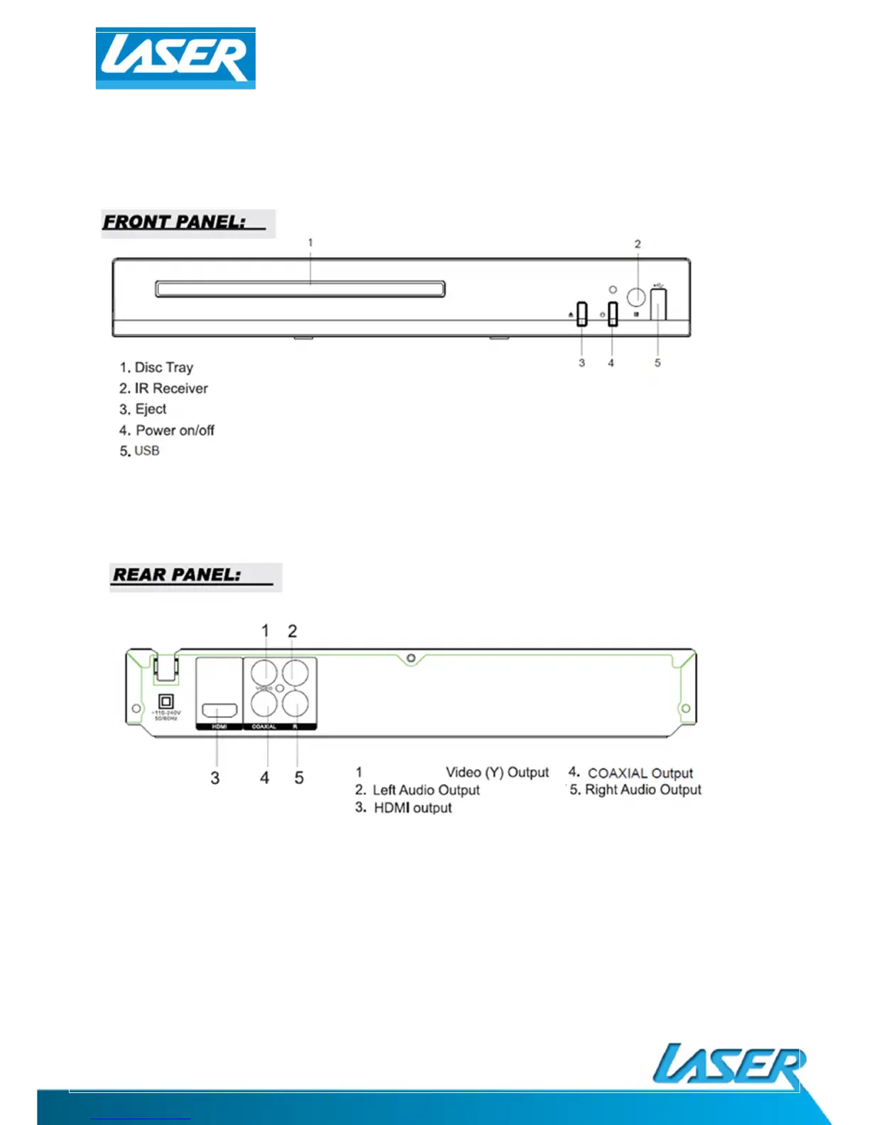 Laser DVD-HD008 - FRONT PANEL; Power on;off; USB; REAR PANEL