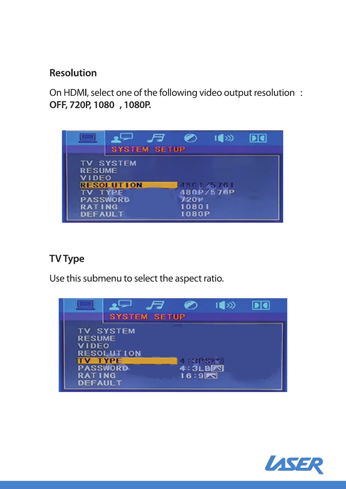 Laser DVD-HD012 - Menu Operation: Resolution and TV Type; Video Output Resolution Settings; TV Type Aspect Ratio Selection