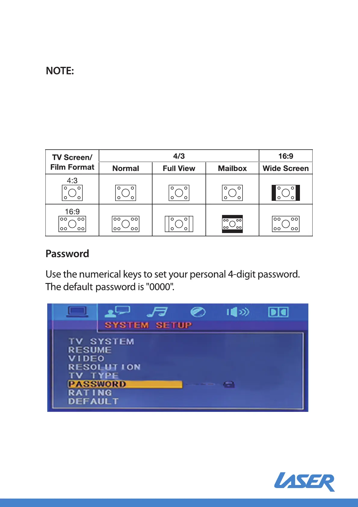Laser DVD-HD012 - Menu Operation: Aspect Ratio and Password; Aspect Ratio Display Examples; Password Setup