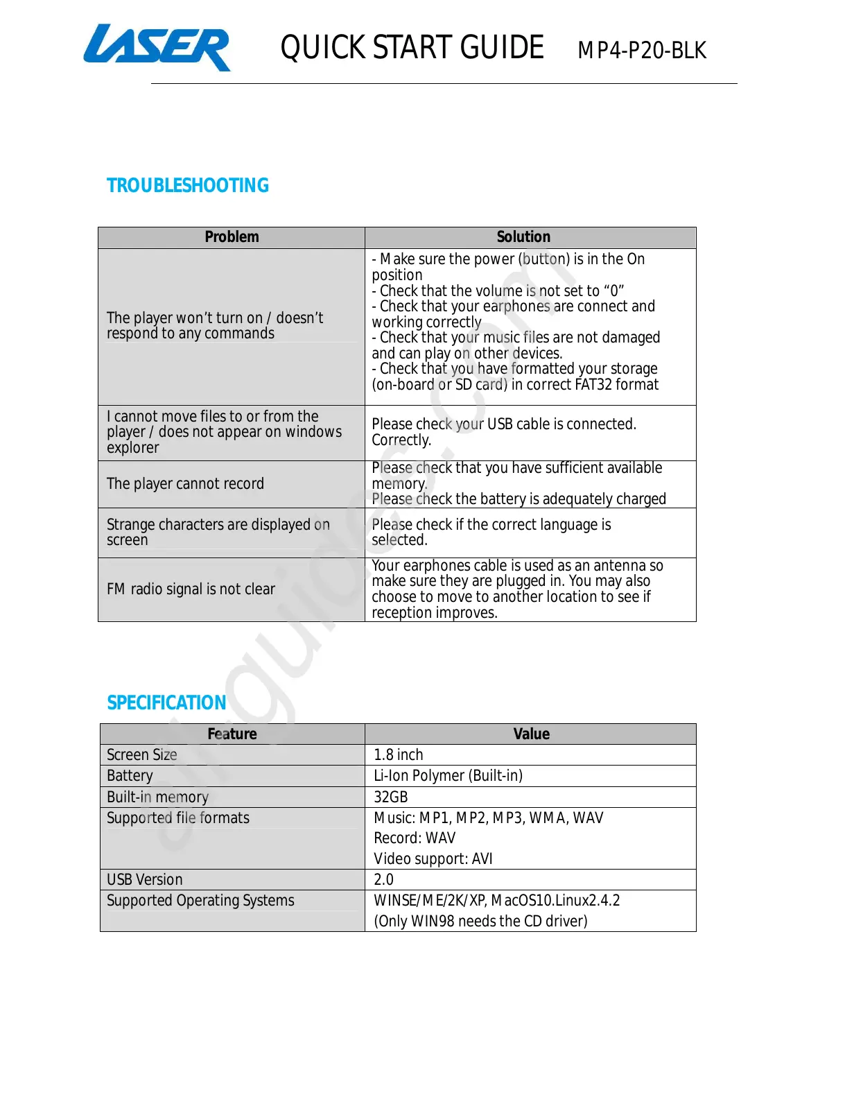 QUICK START GUIDE MP4-P20-BLK