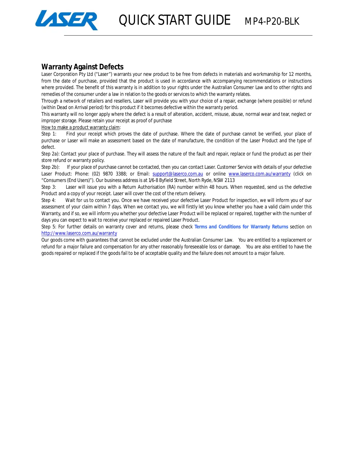 Laser Corporation Pty Ltd (“Laser”) warrants your new product to be free from defects in materials and workmanship for 12 months,